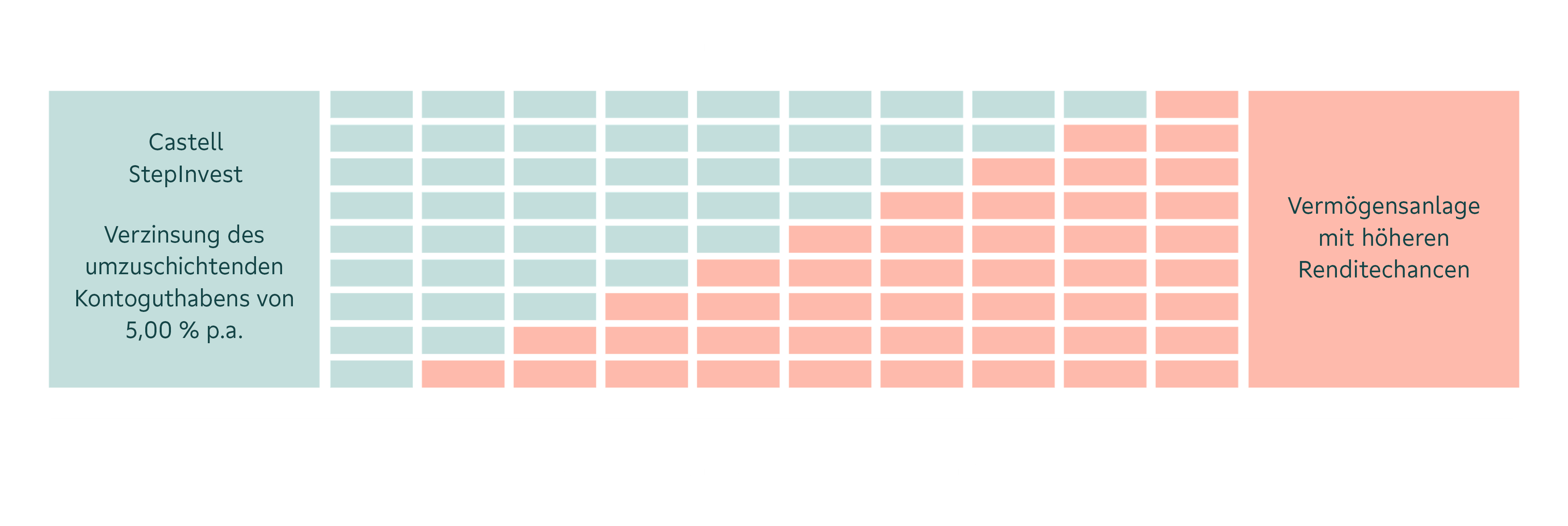 Castell StepInvest als praktische Kombination aus Geldanlage und Wertpapierinvestment - Ihre Geldanlage wird mit 5,00 % p. a. verzinst und in definierten Schritten über einen Zeitraum zwischen 6 und 12 Monaten in eine von Ihnen ausgewählte Anlagelösung umgeschichtet.