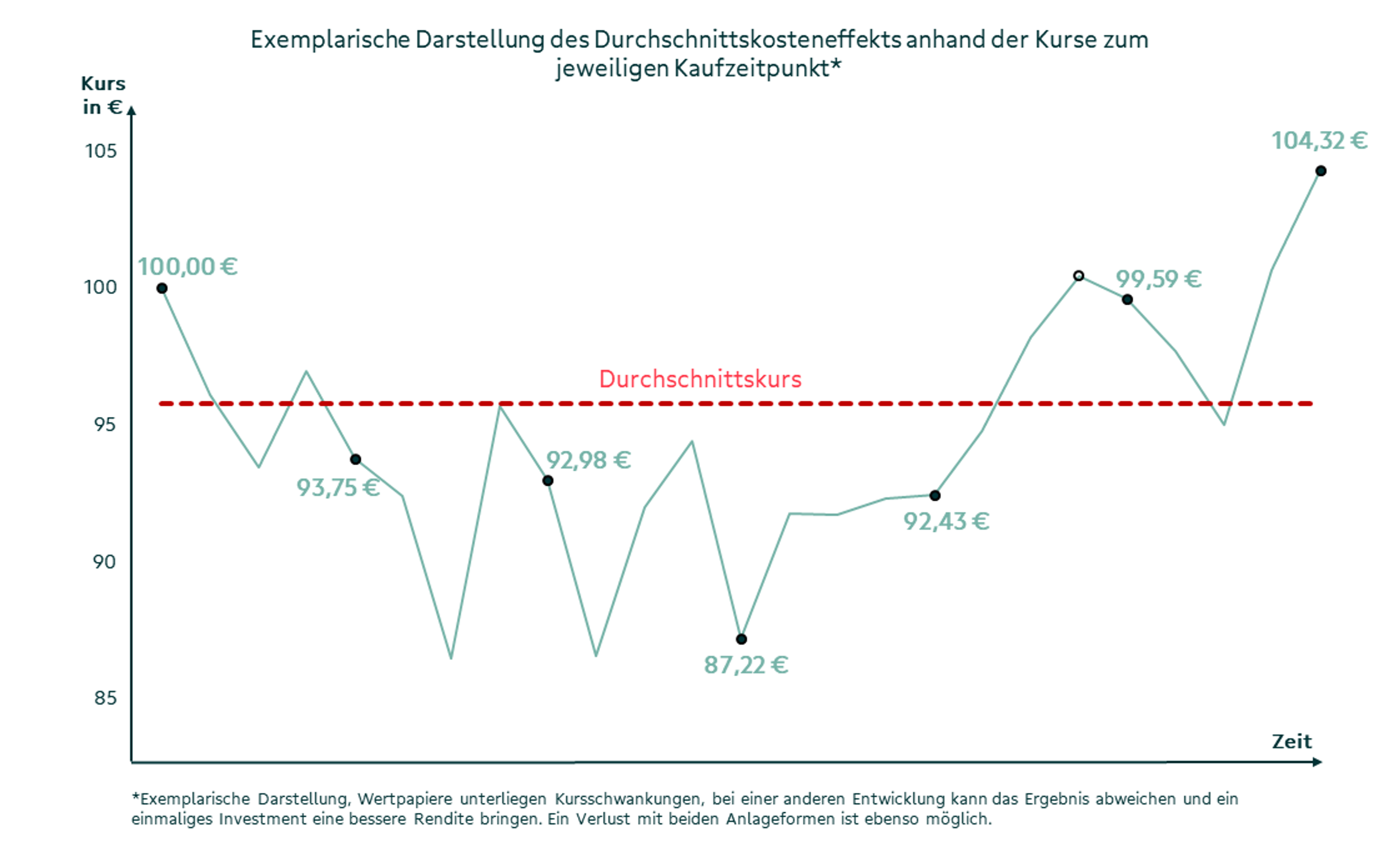 Über einen längeren Zeitraum ergibt sich dadurch ein durchschnittlicher Kaufpreis, der niedriger sein kann als der Höchstkurs während des Investitionszeitraums („Durchschnittskosteneffekt“).